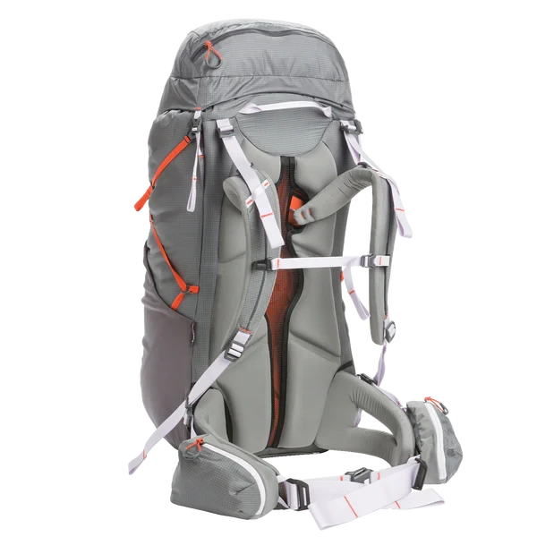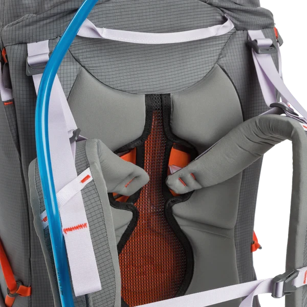 - 60L women’s multiday pack with adjustable fit through custom frame sheet and shoulder straps that deliver positive load transfer for more balance on the trail