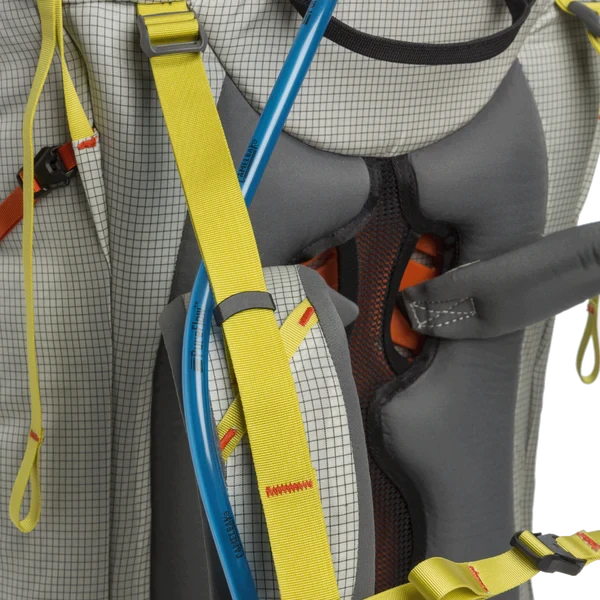 - Internal 3L hydration bladder pocket with bladder hook, discreet tube routing port, and hose keeper clip on sternum strap