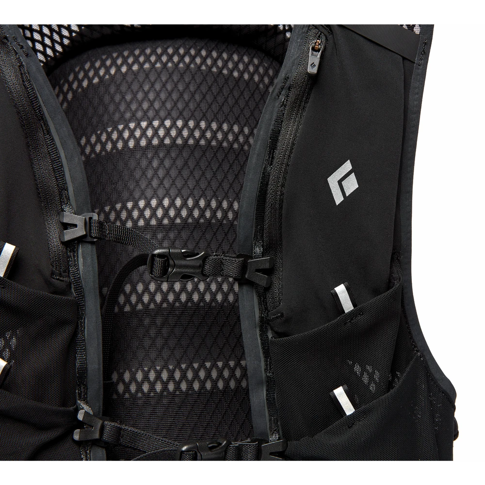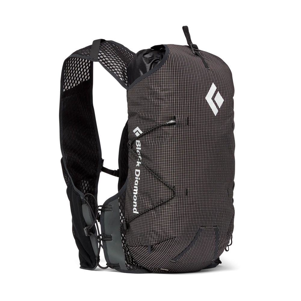 The Distance 8L Pack is engineered to redefine your line, from the trail runs that bleed into rocky scrambles, to alpine adventures that cover a wide spectrum of mountain terrain, this hybrid pack blends running vest technology with our intimate knowledge of alpine pack systems to carry the gear you need, while remaining featherweight and comfortable enough to move at a fast clip. Built from our UHMWP 10x Ripstop Yarns—the same burly material we use in our climbing dogbones and Ultralight Camalots—the Distance’s fabric is literally 10-times stronger than steel per weight, while remaining so light it floats in water. The shoulder strap harness system utilizes our Stitch-less Edge Taping Technology—meaning the shoulder strap edge binding is fully edge taped instead of sewn, more like today’s innovative sportswear then a traditional running backpack—which allows for superior comfort, movement, and weight reduction. Also, the harness system is constructed with an adjustable, elastic-cording side compression system, which gives you a more secure ride while running scrambling and climbing. This vest-like system also includes dual flask pockets that fit two BD HydraPak® SoftFlask™ (sold separately) and a Deploy pocket to stash the BD Deploy Wind Shell. The pack portion of this Distance includes a quick Blitz-style main opening with a stash pocket to tuck away essentials, while a mesh divider wall can store cordelette or a water bladder that can integrate with the pack’s hose routing. On the pack’s exterior, the Distance 8 includes dual piolet/ice axe holsters, and dual Z-Pole quiver sleeves to stash your trekking poles when the terrain changes. Dual front stretch pockets are an extra place to stash nutrition or gear, making the Distance 8 an ultra-versatile pack for moving light and fast in the mountains.
