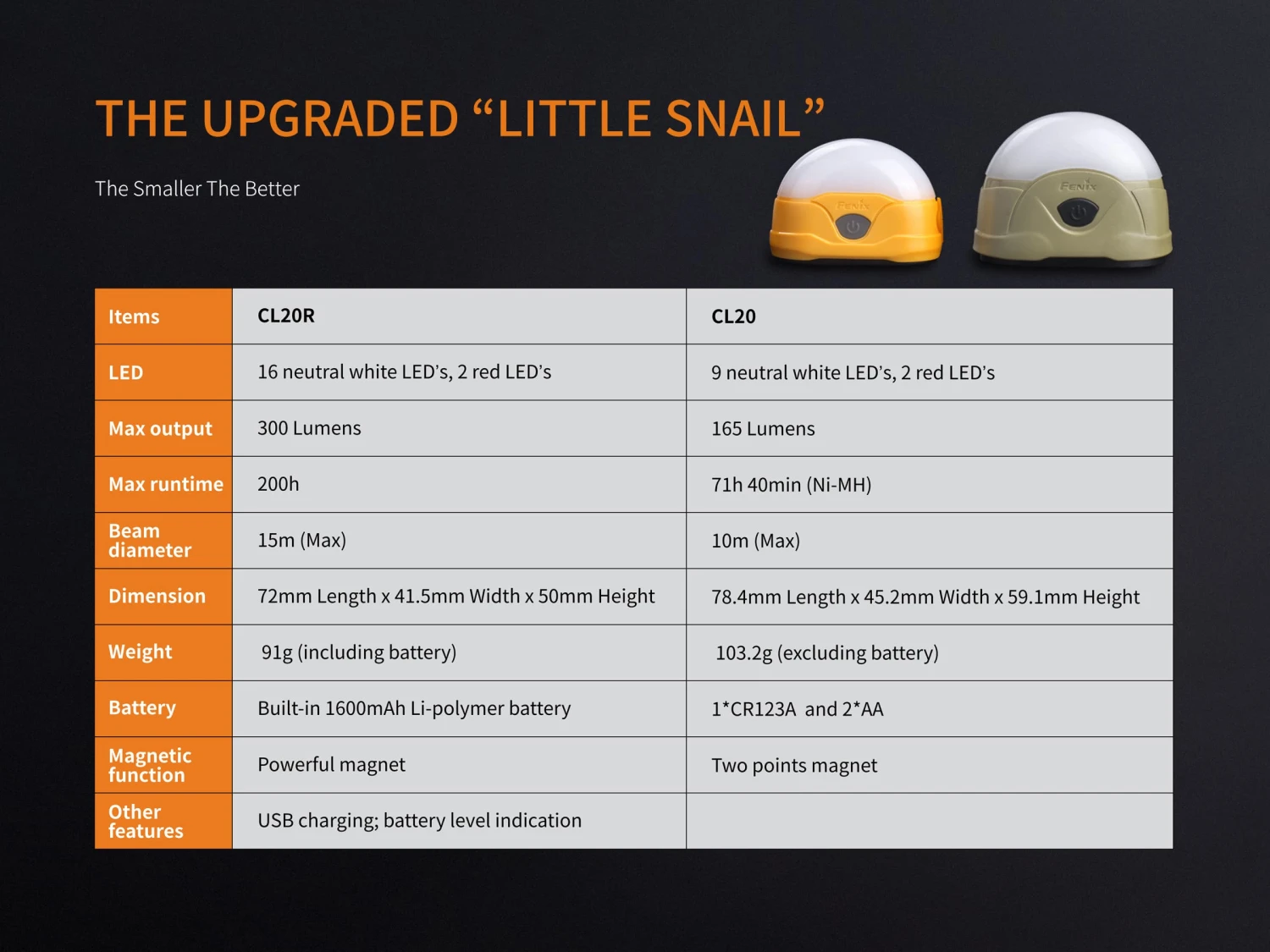 CL20R is a rechargeable high-performance camping lantern. It is fitted with neutral white LED’s and red LED’s, which emits a max output of 300 lumens. The white light features 4 output levels and the red with 2, perfectly meet the lighting demands in various camping environments. Powered by the built-in 1600mAh Li-polymer battery, CL20R also features charging and battery level indication function. The classic appearance inherits “Little snail”, simple but lovable. In addition, the IP66 rated protection, magnetic bottom and hanging loop make the CL20R portable and convenient as the exceptional camping lantern.