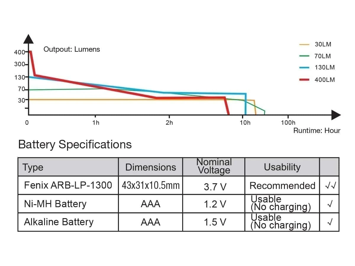 Included 1300 mAh Li-polymer battery pack, headlamp is also compatible with 3 AAA batteries