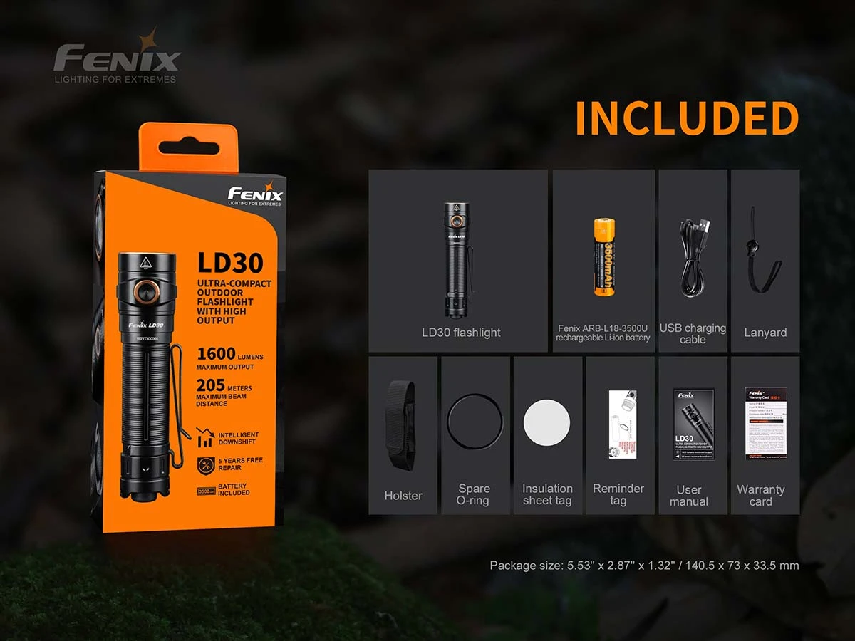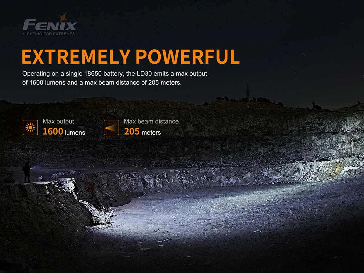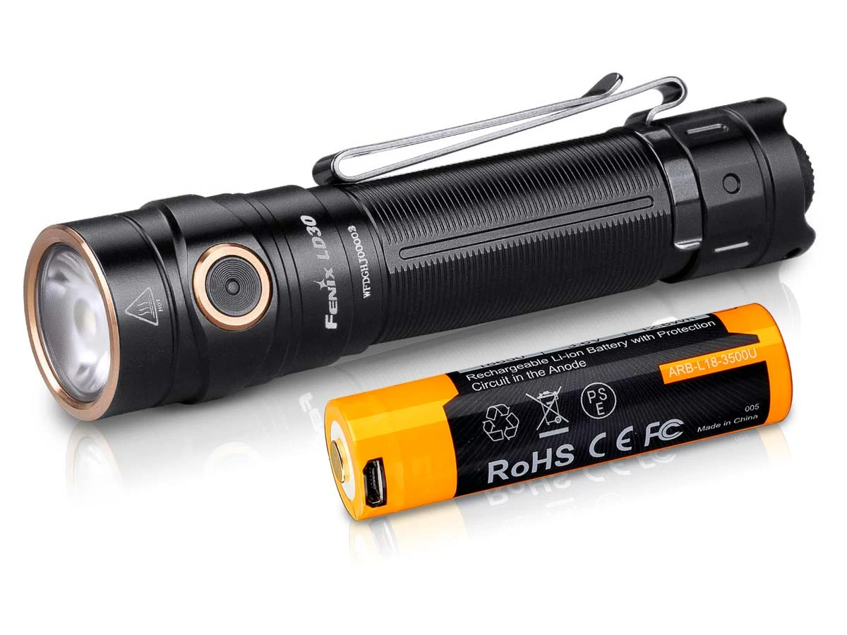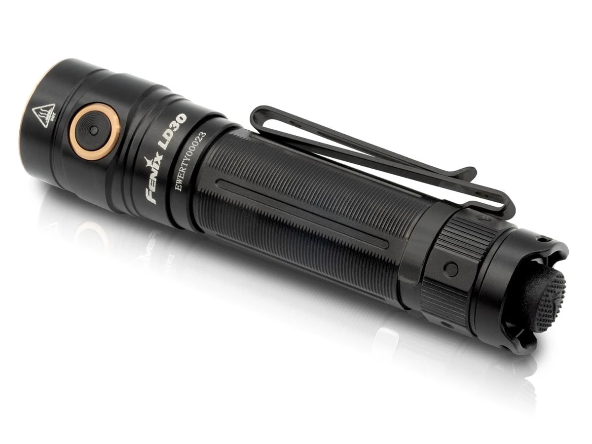The Fenix LD30 is an extremely powerful compact flashlight that can blast a maximum 1600 lumens, 673 feet (205 meters). At only 4.3” long, the LD30 is the perfect size everyday carry EDC flashlight. Quickly activate the flashlight with its tactical tail switch and then cycle through the lighting modes with the side switch. The LD30 flashlight is powered by one 18650 li-ion battery or two CR123As. Other features include a two-position body clip, battery level indicator, and it is IP68 rated waterproof/dustproof.