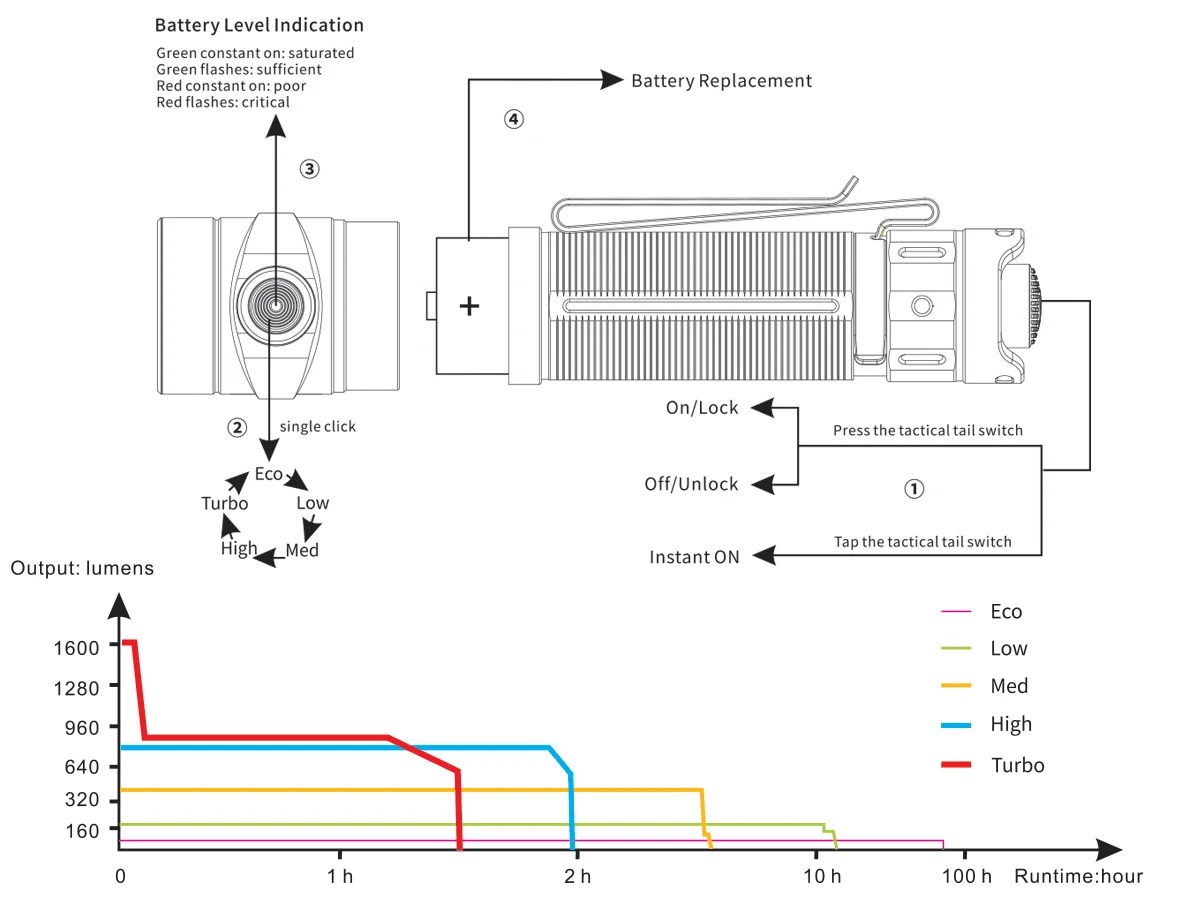 - Powered by a 18650 rechargeable Li-ion battery, two CR123A Lithium batteries can be used for emergency.