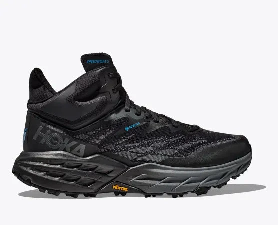 A workhorse for sloppy, wet conditions, the Speedgoat 5 Mid GTX is built with the same GORE-TEX membrane as its lower profile counterpart, along with a soft heel tab to accommodate the Achilles and flexible collar for extra ankle support. Grounded in Vibram® Megagrip with Traction Lug for enhanced grip on loose soil, this trail icon employs a foot-cradling heel bolster, rubber toe cap, and gusseted tongue to keep trail debris at bay.