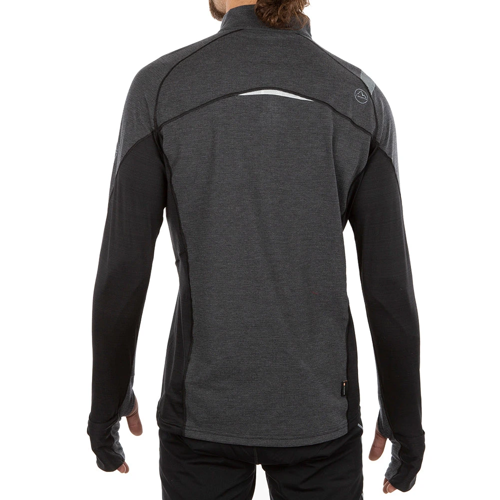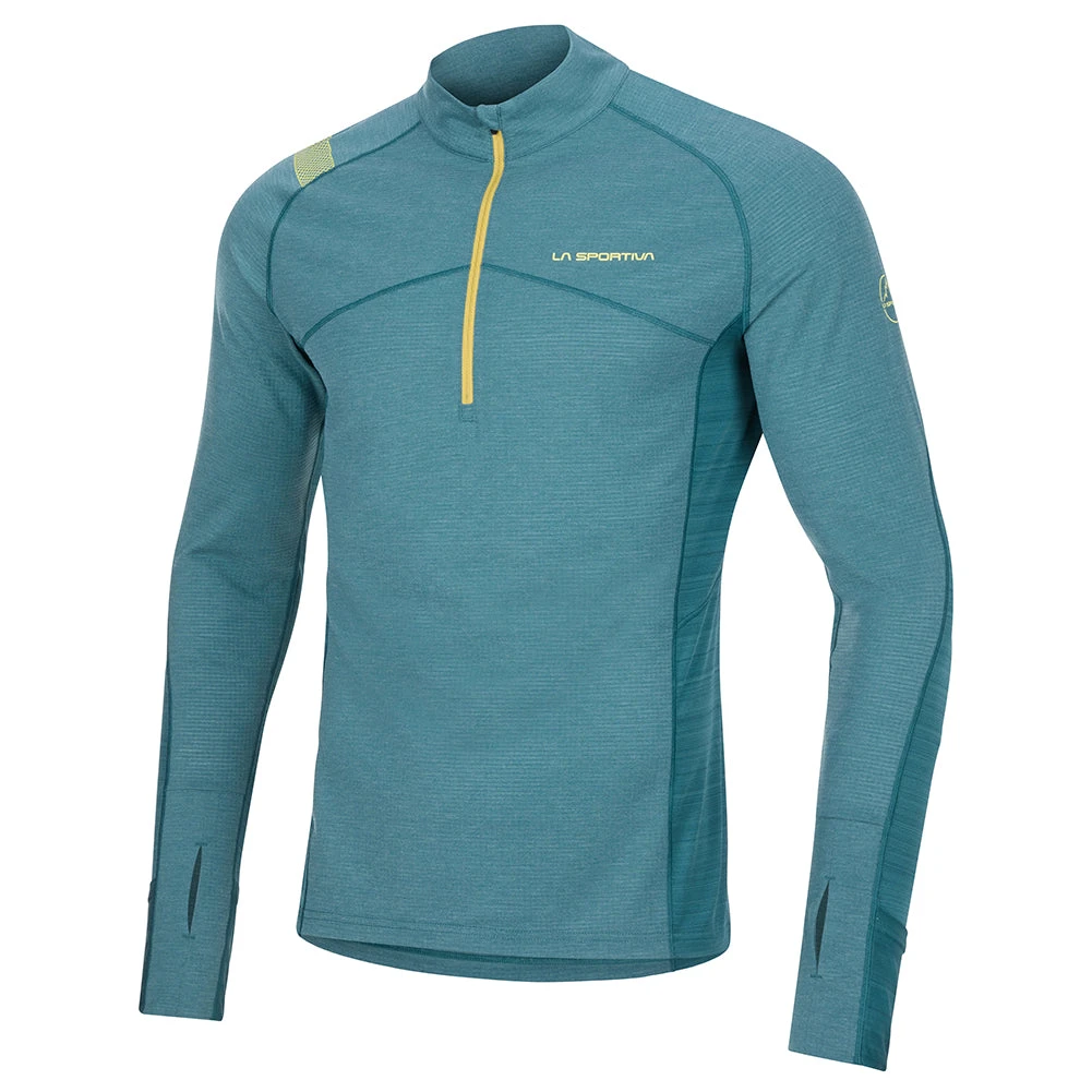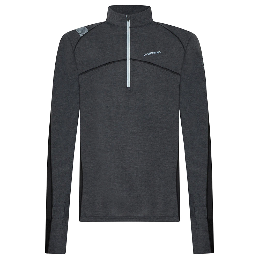 Our long sleeve running shirt with a quarter zip, thumbholes, and high neck. Perfect for any run where you need moisture wicking performance and a little extra warmth.