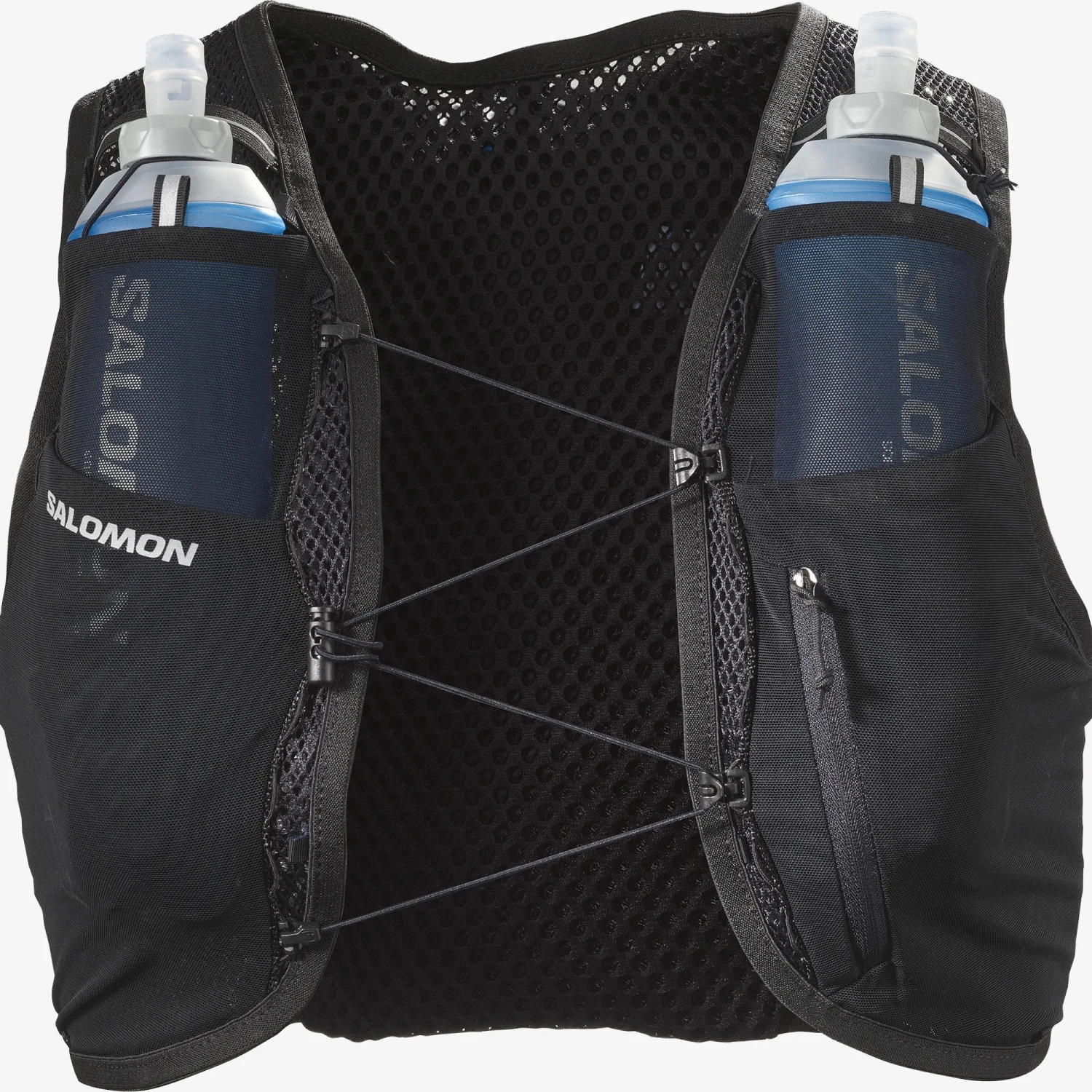 Designed to fit Salomon soft flasks, these front pockets limit bouncing. Top elastic loops secure your flasks and keep them ready to drink.
