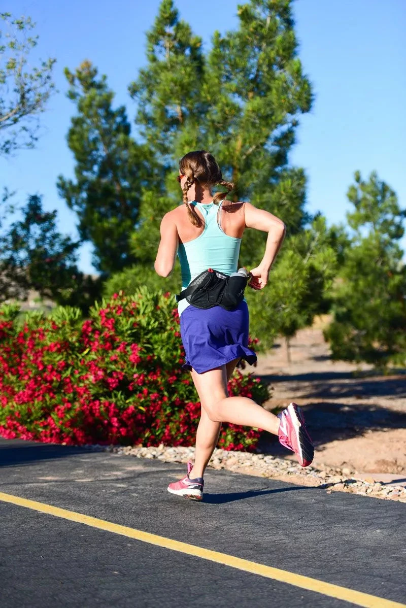 The Essential Bottle Pack is a road runners dream hydration waist pack. This water belt comes standard with a 550 mL UltraFlask in the mesh pocket. It can hold your phone (up to an iPhone 7+) and comes with a bungee cord for a jacket or shirt. The Essential Bottle Pack is made with a conical shape that allows for a comfortable fit and a bounce free ride. Adjustable strap allows for one size to fit most.