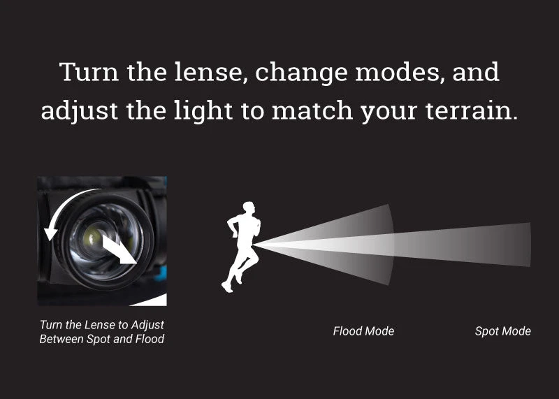 - PerfectAngle™: Easily adjust up, straight, or down to suit your terrain. Illuminate your path while keeping your head and body in a natural running position.